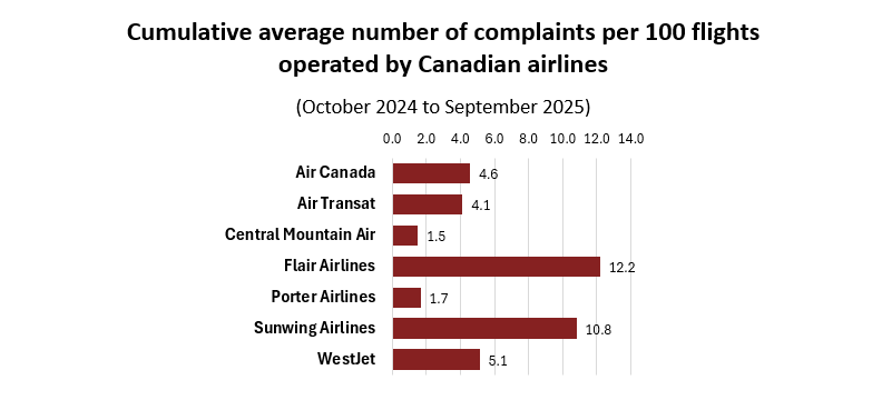 Bar graph: cumulative average number of complaints per 100 flights operated by Canadian airlines from October 2024 to September 2025