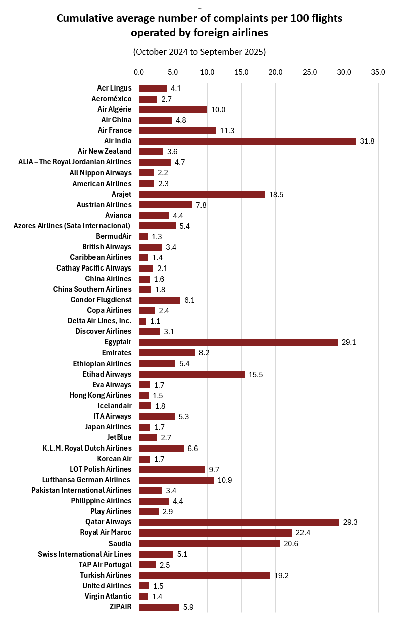 Bar graph: cumulative average number of complaints per 100 flights operated by foreign airlines from October 2024 to September 2025