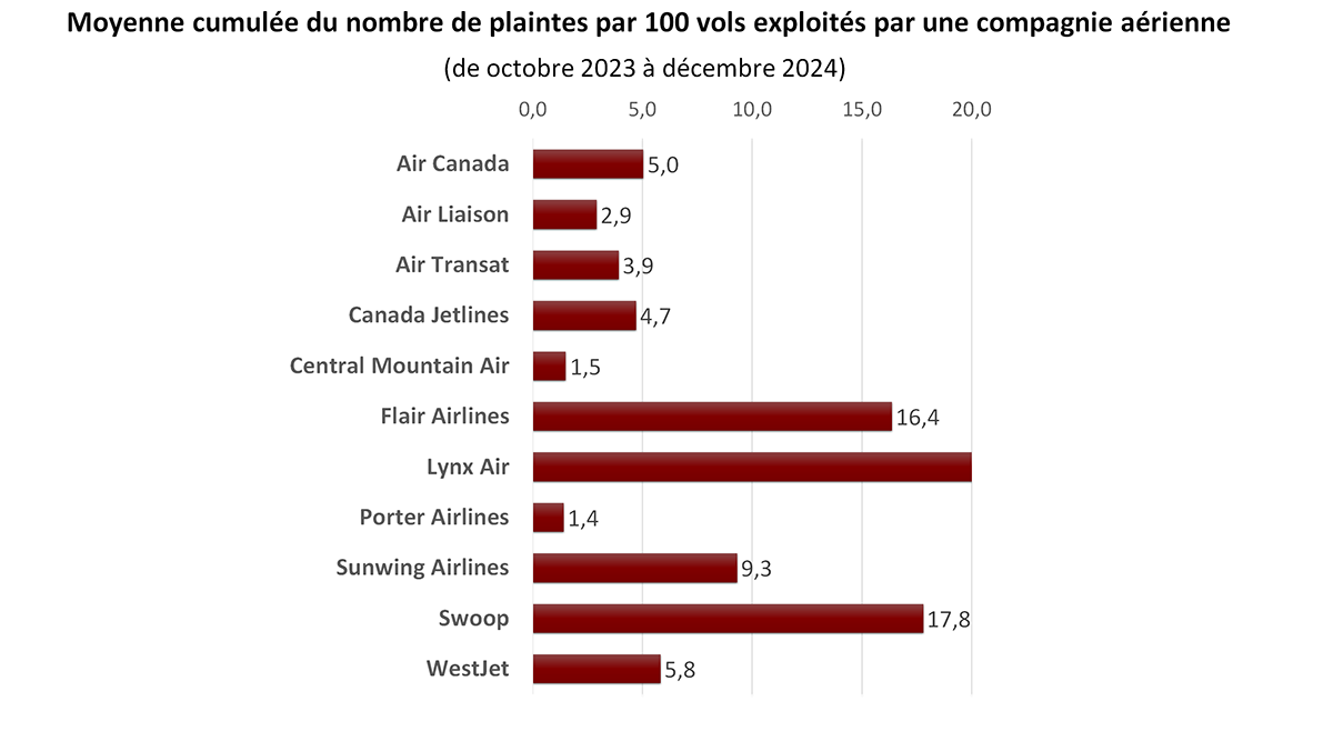 Graphique à barres: moyenne cumulée du nombre de plaintes par 100 vols exploités par une compagnie aérienne canadienne de octobre 2023 à décembre 2024