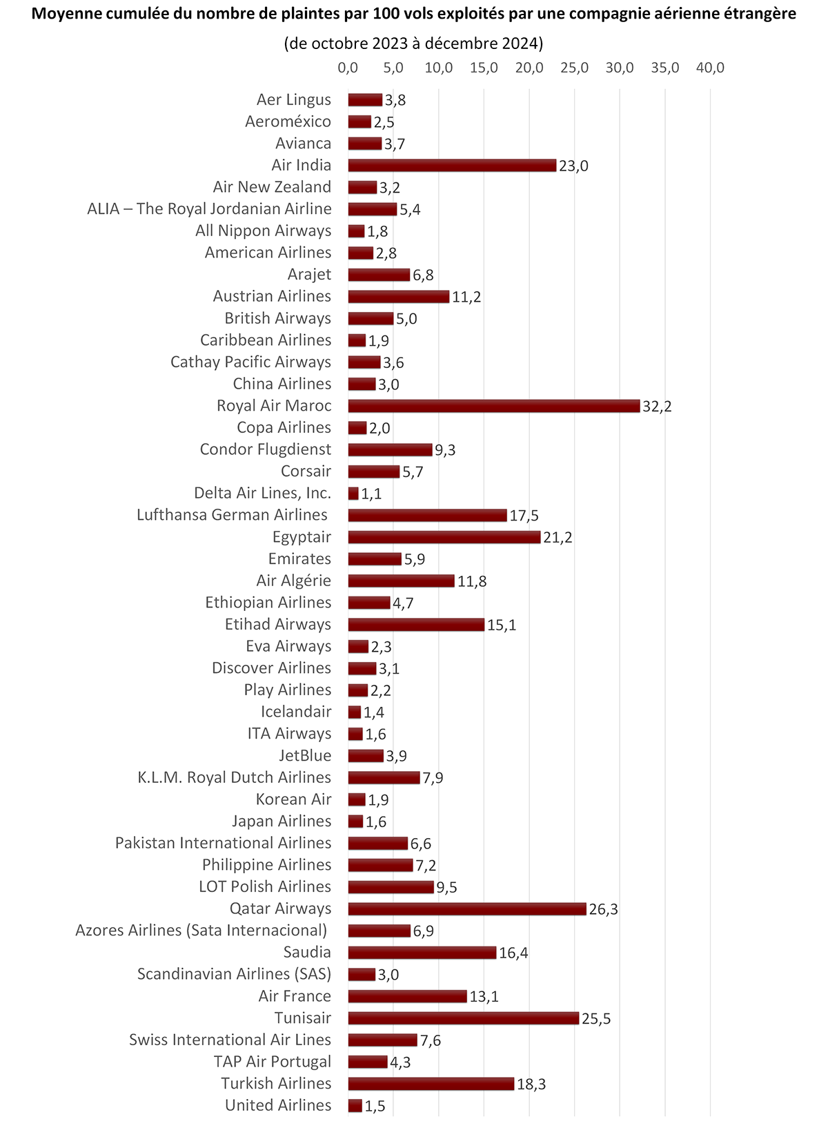 Nombre de plaintes aériennes par 100 vols – par compagnie aérienne – octobre 2023 à décembre 2024